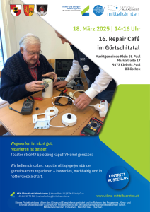 Das Repair Café geht in die nächste Runde. Es freut die KEM sehr, dass das Repair Café so gut angenommen wird, daher findet am Mittwoch, den 18. März, ab 14 Uhr das nächste Repair Café in der Bibliothek der Marktgemeinde Klein St. Paul statt. Marktgemeinde Klein St. Paul Karte